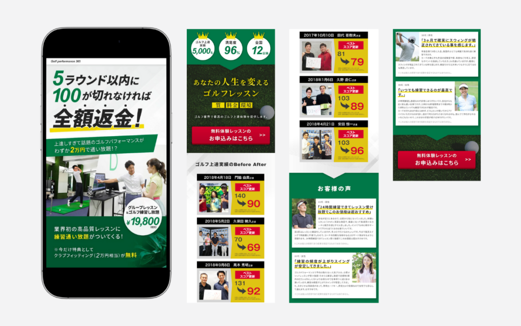 ゴルフレッスンに不安を感じている人でも安心して内容を理解できるよう、「信頼感」と「わかりやすさ」を重視して構成しています。全体の基調色にはグリーンを使用し、ゴルフを連想させると同時に、落ち着きと誠実さを感じられる印象を持たせました。ファーストビューでは数字や写真を大きく配置することで、実績や強みが直感的に伝わるよう工夫しています。