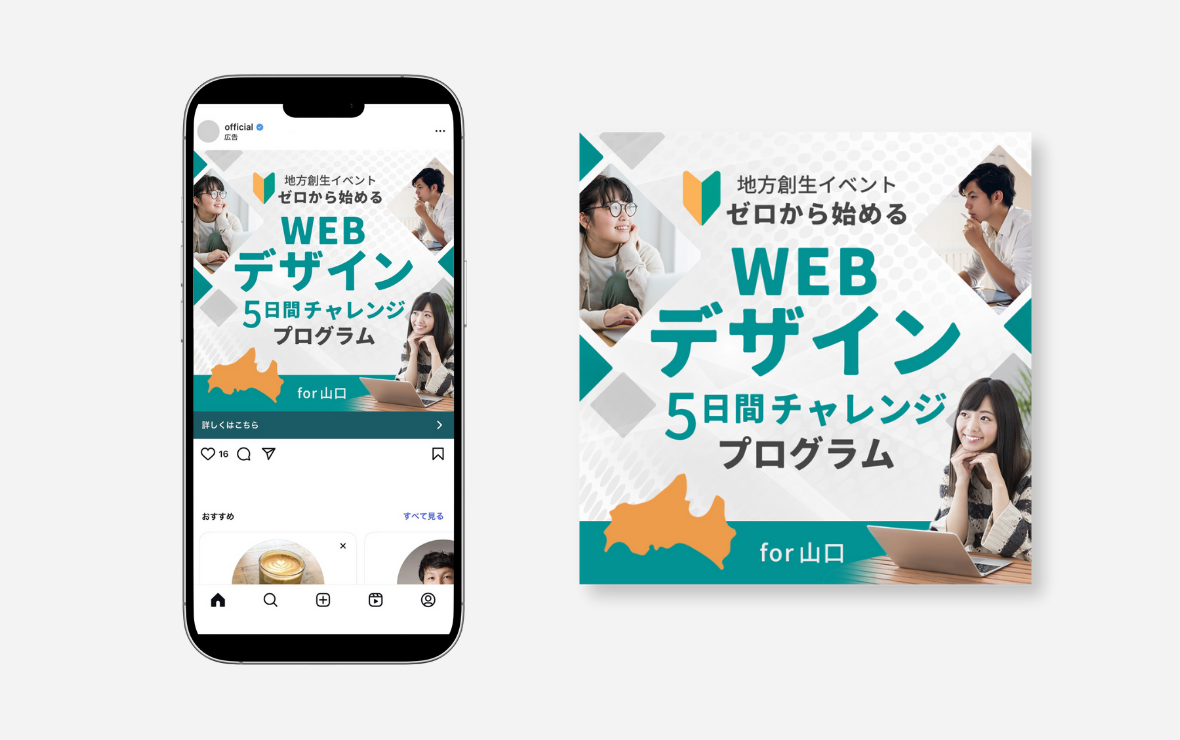 Webデザインに初めて取り組む人でも参加しやすい印象を与えるため、全体に明るく親しみやすいデザインを意識しています。メインカラーにはグリーン系を使用し、成長や前向きさ、学びのスタートを感じさせる雰囲気を表現しました。背景にはやわらかな模様や図形を重ねることで、単調にならず、楽しさと動きのある印象を加えています。タイトルは大きく中央に配置し、内容が一目で伝わるよう視認性を重視しました。人物写真をターゲットの男女比に合わせた人数で配置し、実際の参加者像をイメージしやすくした上で、学びの場に対する安心感や共感を高めています。
